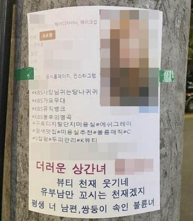 - '더러운 상간녀 ○○○, 뷰티 천재 웃기네. 유부남만 꼬시는 천재겠지.'