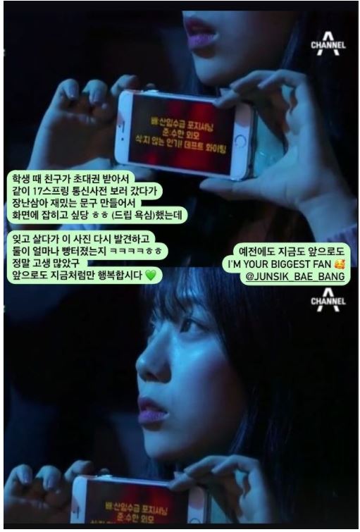 박지선 통역은 방송에 잡힌 이미지를 공개하며 "학생 때 친구가 초대권을 받아서 같이 17스프링 통신사전을 보러 갔다가 장난삼아 재미있는 문구 만들어서 화면에 잡히고 싶다 했는데 잊고 살다가 이 사진을 다시 발견하고 둘이 얼마나 빵터졌는지. 정말 고생 많았고 앞으로도 지금처럼만 행복 합시다"라며 예전에도 지금도 앞으로도 i'm your biggest fan"이라고 적었습니다.