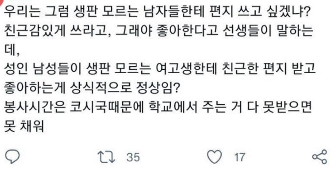 - 여고생은 "군대에서 노래도 부르잖아요. 사나이로 태어나 어쩌고~"라고 쓴 부분을 지운 후 "지우래요"라고 적음.