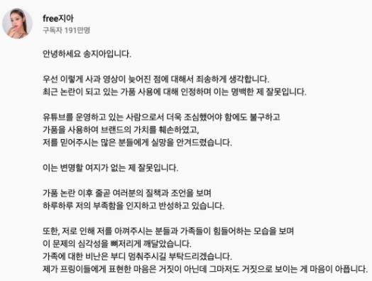 송지아는 "최근 가품 착용 논란에 대해 인정하며 모든 것이 내 잘못"이라며 "유튜브를 하는 사람으로서 모든 행동에 신중하고 조심해야 했는데 브랜드의 가치를 훼손시키고 저를 응원해 주시는 많은 분들께 실망을 안겨드린 점에 대해 죄송하다"고 사과했습니다.
