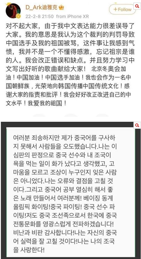 - 중국에 대한 애국심도 보여줬는데 그는 "중국어 공부를 열심히 해서 좋은 노래를 만들어 여러분께 들려드리겠다"며 "저도 중국 조선적으로서 한국에 중국 정통 문화를 영광스럽게 전파하겠다. 나는 나의 조국을 사랑한다"고 함. 해당 SNS 글 역시 현재 삭제된 상황. (인스타그램에는 중국어로 된 악플이 도배됐고 가족 살해협박까지 올라옴)