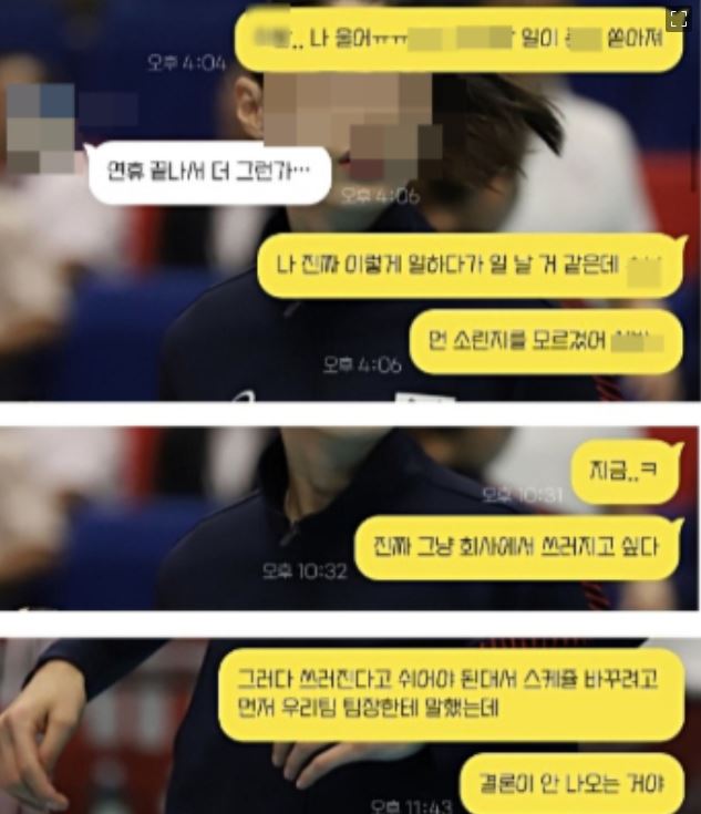 - 그는 "온종일 업무 생각 때문에 미칠 것 같다"며 "직장 그만두는 것보다 그냥 혼자 이렇게 하는 게 마음이 더 편할 것 같다"고 적음.