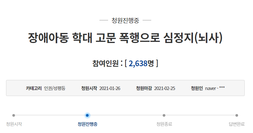 - 청원인은 '지적 장애아 A군이 2020년 11월 18일 구미의 한 장애인학교에서 심정지 상태로 119에 신고돼 병원에 이송됐지만 자가호흡이 불가능해 인공호흡기를 장착한 채 2개월이 넘도록 의식불명상태'라며 'A군의 몸에 남아 있는 상처가 학대행위가 아니고서는 도저히 설명되지 않는다'고 주장함.