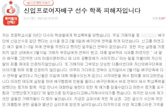 2월 16일 네이트판에 '신입 프로 여자배구 선수 학폭 피해자입니다'라는 제목의 글이 올라왔습니다. 해당 글 작성자 A씨는 '초등학교 시절 3년간 다수의 학생에게 폭력을 당했다'라며 '주요 가해자 중 한명인 B선수가 모 배구단에 입단했다는 소식을 듣고 2월 8일 구단에 연락도 했다'라며 글을 시작했습니다. 이 사실은 접한 구단은 '사자대면해 합의를 보라'며 2차 가해를 했다는 주장입니다.