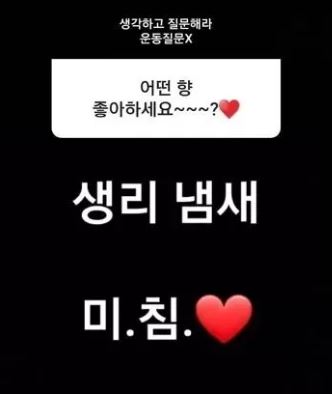 이를 본 한 팬이 "생리 냄새 발언은 논란될 수도, 지우는 게 나을 듯"이라고 지적하자"개인 취향이 왜 논란이 되냐. 난 생리냄새를 좋아한다"고 재차 답했습니다. "생리 냄새가 왜 좋냐"는 물음에는 "야하잖아. 나만 맡을 수 있고"라는 답변을 남겼습니다.