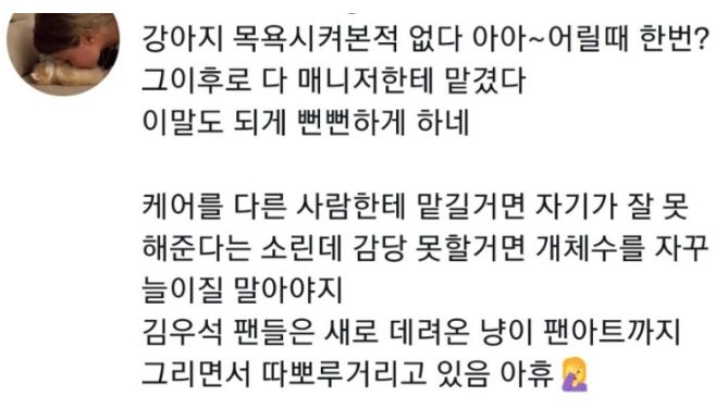 - 글쓴이는 김우석이 강아지 고양이를 사랑하는 애견인인줄 알았는데, 현재 올라온 사진에는 강아지 상태가 말이 아니라고 함.