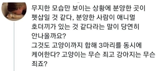 - 이러한 모습에 "이게 케어하는게 맞는지 의심스럽다"며 "케어를 해도 왜 심해지며 그 와중에 다른 반려동물들은 왜 데려오는지 이해를 못하겠다"고 함.