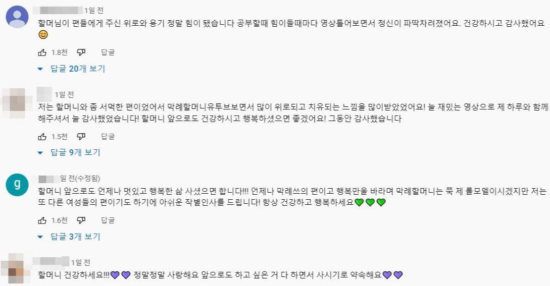 - 유튜브 영상 댓글에는 "할머니 행복하세요, 건강하세요" 등 이별 댓글이 줄줄이 달림.