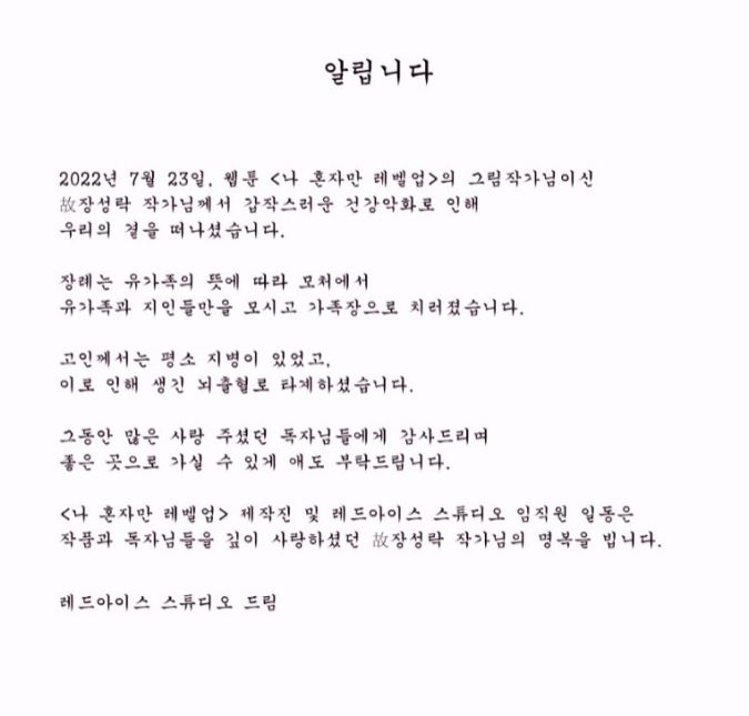 나 혼자만 레벨업을 제작하는 레드아이스 스튜디오는 "2022년 7월 23일, 웹툰 '나 혼자만 레벨업'의 그림작가님인 장성락 작가님이 갑작스러운 건강악화로 인해 우리의 곁을 떠났다"고 밝혔습니다.