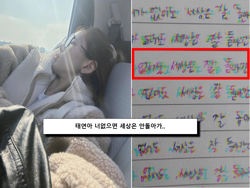 해당 게시글 가운데, 태연은 "내가 없어도 세상은 잘 돌아간다"라는 문구가 노트에 빼곡히 적혀 있는 사진을 올렸습니다.