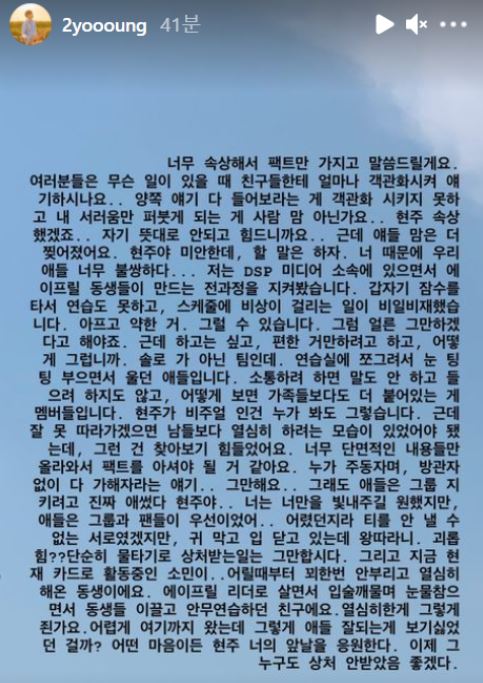 - 그는 최근 이현주 동생의 폭로 이후 멤버 중 일부만 괴롭혔다는 오해가 있어 글을 쓴다고 밝힘
