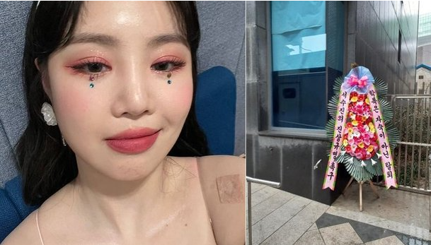 수진의 학교폭력 논란으로 인해 탈퇴를 촉구하는 이들이 많아지는 가운데, 소속사에 화환이 배달된 것이 알려져 눈길을 끌고 있습니다.