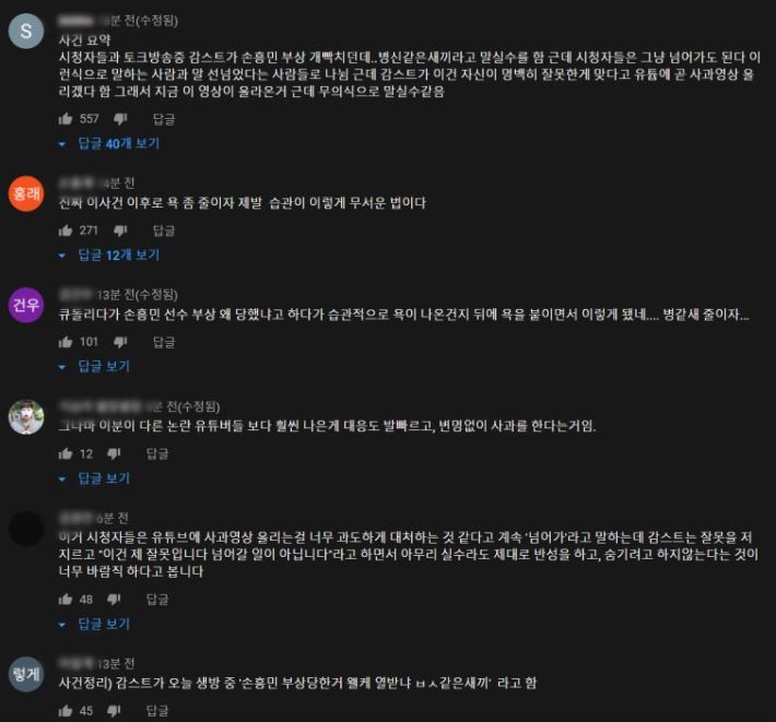 - “손흥민 선수를 오랫동안 정말 좋아했고 응원했던 축구 팬으로서 괜히 저의 발언으로 인해 피해를 드린 거 같아 정말 다시 한 번 죄송하다는 말 드리고 싶다”