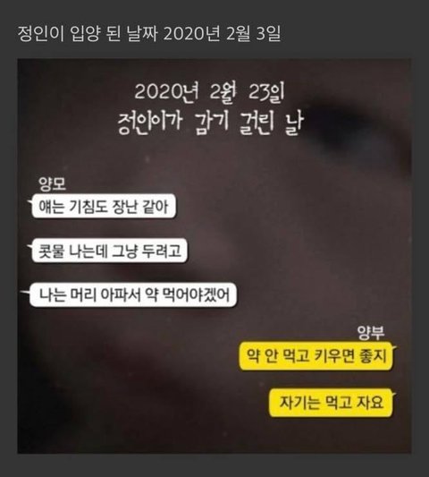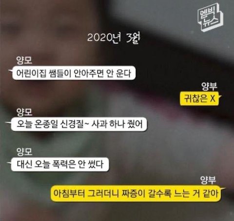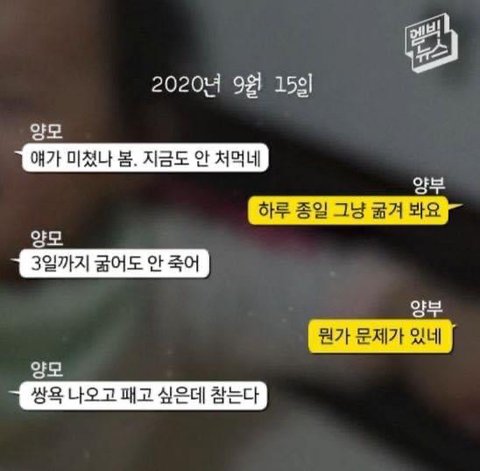 최근 검찰은 정인이 양모에게 사형, 양부에게 징역 7년 6개월을 각각 구형했습니다. 현재 정인이 양부, 양모가 삭제한 카톡 복원 내용이 화제가 되고 있는데요. 정인이 양부모가 나눈 카톡 내용은 다음과 같습니다.