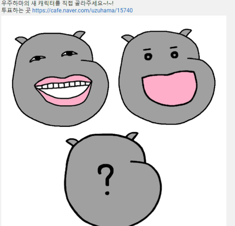 우주하마는 '기존 우주하마 캐릭터는 원작자님의 요청으로 더 이상 사용할 수 없게 되었습니다'라고 말하며 '우주하마의 새 캐릭터를 직접 골라주세요~!라는 글과함께 캐릭터 사진을 올렸습니다. 공개된 사진에는 기존 캐릭터와 별반 다를게 없는 모습에 이를 지적하는 사람들이 많았습니다.