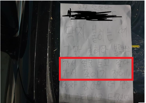 이어 '지하 4층까지 주차장에 자리가 많은데 이렇게 해놨네요'라고 덧붙이며, 공개한 사진을 보면 벤츠 차량이 주차장 통행로 벽 쪽에 세워져 있고, 앞쪽 창문에는 '긴 말 안 한다. 딱지 붙이는 새× 그만 붙여라. 블랙박스 까서 얼굴 보고 찾아가서 죽이기 전에. 주차 공간을 더 만들든가. 허리디스크 터졌다'라고 적힌 쪽지가 붙어 있다고 말했습니다.