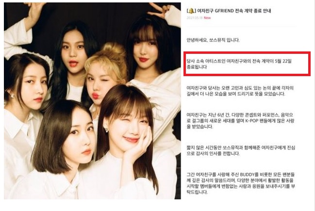 쏘스뮤직은 '여자친구는 다양한 콘셉트와 퍼포먼스, 음악으로 걸그룹의 새로운 세대를 열며 팬들에게 많은 사랑을 받았다'라며 '짧지 않은 시간 동안 쏘스뮤직과 함께해준 여자친구에게 진심으로 감사의 인사를 전한다'고 전했습니다.