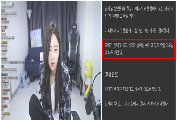 - 그러면서 "그땐 좋아하니까, 헤어지기 싫어 나만 참자고 생각하고 증거 수집도 안했다"라며 "다른 BJ와 성매매 한 거 통화 녹음은 있는데, 휴대전화가 고장나서 내일 고칠 예정이다"고 성매매 증거도 있다고 밝혔습니다.