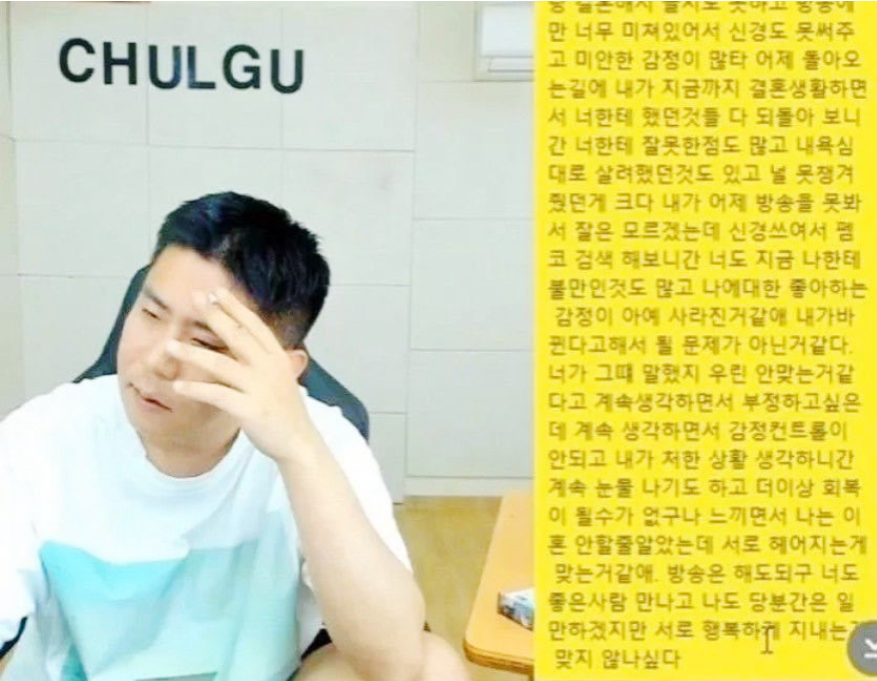 철구는 "담배도 피면서 안 피는 척하고 디스코드에서 패드립 하면서 놀고 난 다시 한번 말씀 드리지만 지혜한테 내가 먼저 '야 XXX아 뭐하는 짓이냐' 한 적 단 한 번도 없다"라며 "네가 애 엄마면 내가 들어오면 수고했다는 말 한마디가 그렇게 힘드냐고 좋게 말할 때도 욕으로 돌아온 애다. 법정에서 뵙겠다"고 덧붙여 이혼을 암시했습니다.