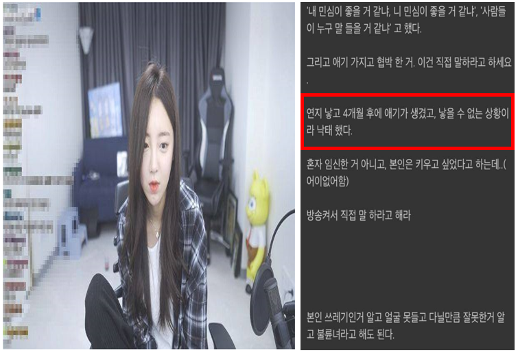 그러자 BJ 철구 역시 생방송을 진행하며 ”낙태 얘기 해드리겠다. 걔 지금 잘못 생각하고 있는데 연지 낳고 3개월 뒤다? 정확하게 낙태를 3-4번 했다. 연지 두세살 때도 했다”고 말했습니다.