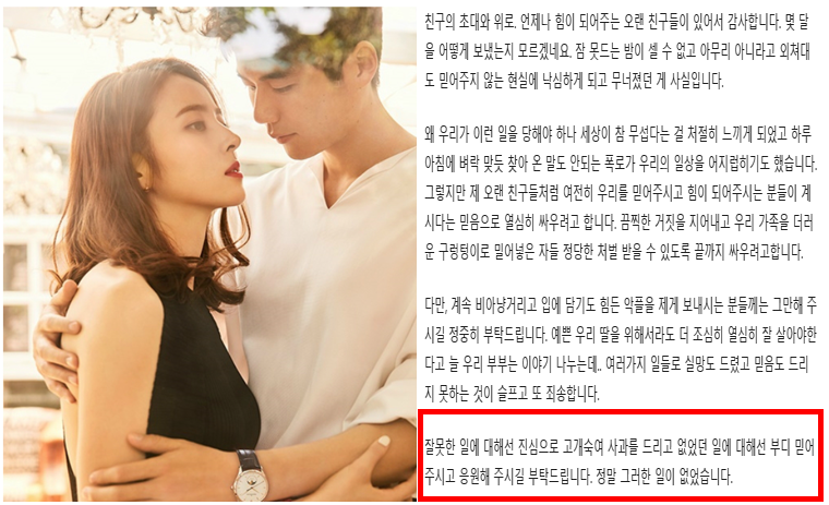 다만, 계속 비아냥거리고 입에 담기도 힘든 악플을 제게 보내시는 분들께는 그만해 주시길 정중히 부탁드립니다. 예쁜 우리 딸을 위해서라도 더 조심히 열심히 잘 살아야한다고 늘 우리 부부는 이야기 나누는데.. 여러가지 일들로 실망도 드렸고 믿음도 드리지 못하는 것이 슬프고 또 죄송합니다.