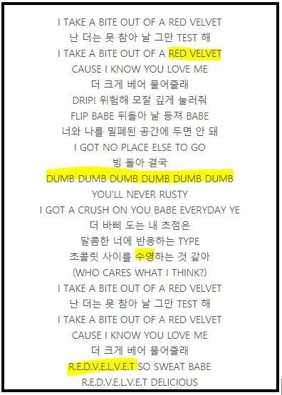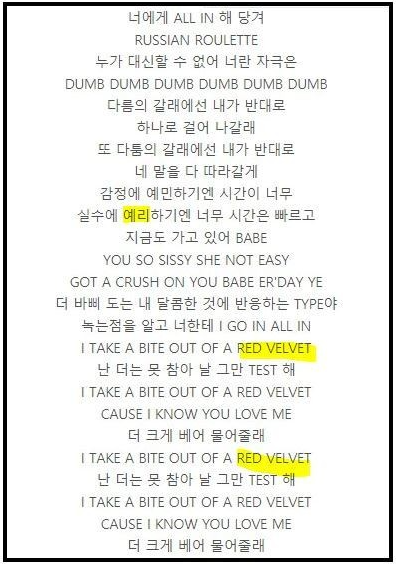 곡 명 자체가 레드벨벳인데다 레드벨벳의 곡 덤덤(Dumd Umd)과 러시안 룰렛(Russian Roulette) 등이 가사에 포함됐습니다.