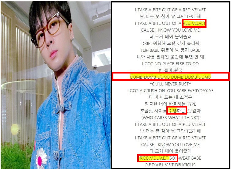 이뿐만 아니라 레드벨벳의 멤버인 조이의 본명인 수영과 다른 멤버인 예리 등의 단어가 라비가 작곡한 레드벨벳 가사에 포함돼 있습니다.