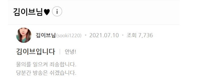 김이브는 별다른 해명없이 방송을 쉰다는 공지만 올린상황이라 정확한 팩트가 나오진 않았습니다. 중립으로 지켜보시면 될 것 같습니다.