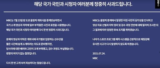- 2021년 7월 23일, 개회식 중계방송 끝 부분에 MBC는 자막을 통해 사과를 전한 바 있음