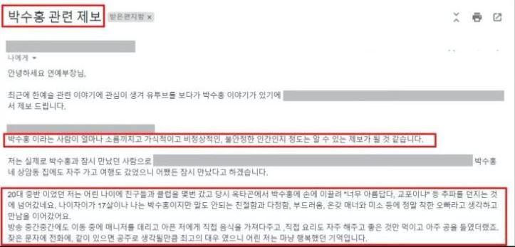 - 공개된 메일에는 "클럽에서 박수홍을 만났다. 17살 차이였지만 너무 친절했다. 그러나 술만 마시면 돌변했고 제가 당한 건 데이트 폭행 수준이었다. 밤새도록 그 눈빛을 못 잊는다. 정말 사람이 사이코패스처럼 달랐다"라는 주장의 메일이였음.