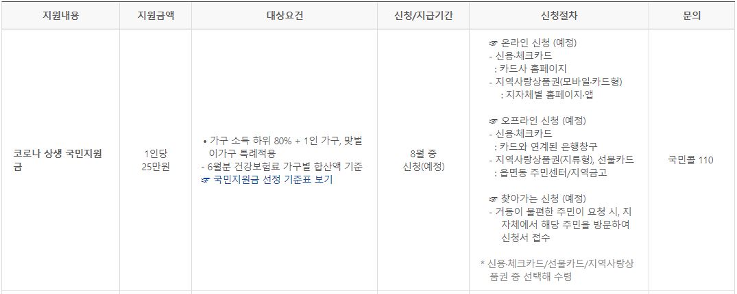 안녕하세요, 아래는 정부 5차재난지원금을 지원내용별로 나눠 논 표입니다. 현재 소상공인 희망회복자금은 신청 중이며 8월 24일 지급 예정입니다.
