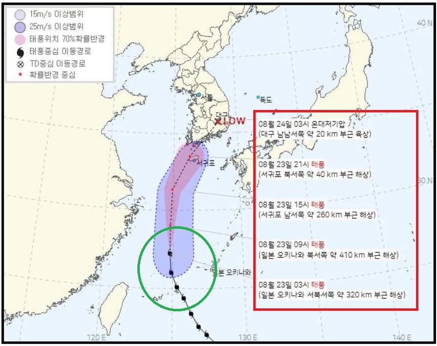 태풍 오마이스는 8월 23일 오후 3시경 중심기압 996헥토파스칼 중심 부근 최대 풍속 초속 20m(시속 72㎞) 강풍반경 150km의 약한 세력으로 서귀포 남서쪽 약 260km 부근 해상까지 접근해 북진하다 남쪽 육상에 상륙한 후 24일 오전 3시경 대구 남남서쪽 약 20km 부근 육상에서 온대저기압으로 변질될 것으로 보여 진다고 합니다.
