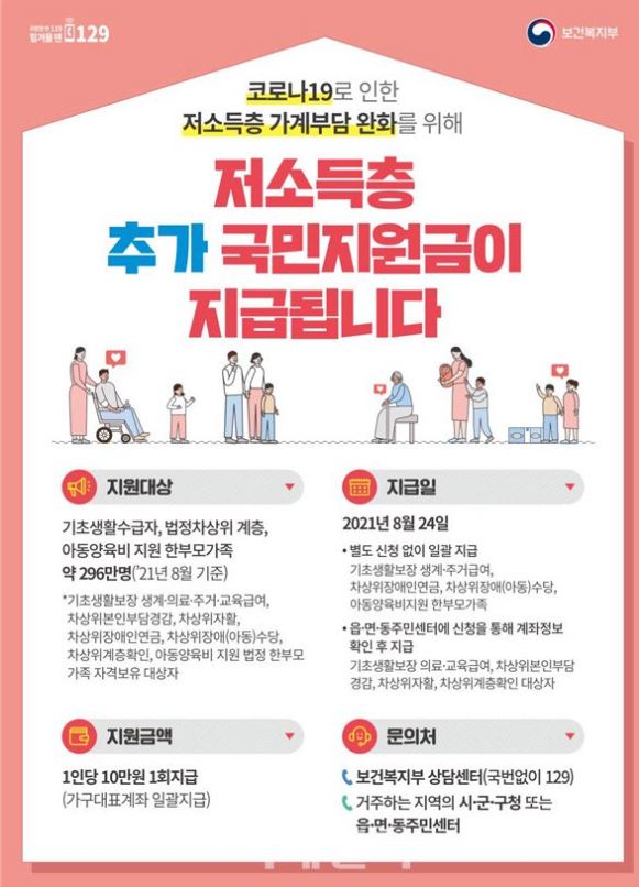 안녕하세요, 국내 신종 코로나바이러스 감염증(코로나19) 사태 장기화로 경제적 어려움을 겪는 저소득층에 24일 추가 국민지원금이 지급됩니다.