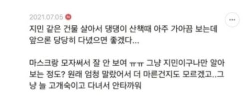 또한 지민과 같은 아파트에 사는 주민임을 밝힌 한 네티즌은 지민이 마스크와 모자를 쓰고 강아지 산책을 시킨다고 언급했습니다.