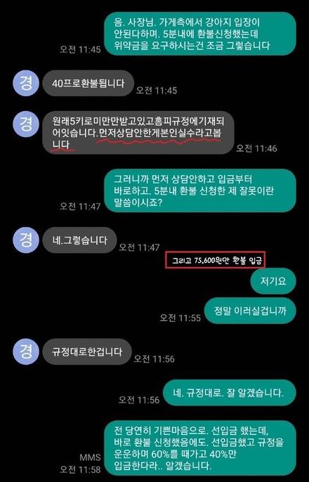 - 그러나 펜션 사장은 가게 규정을 이유로 40%의 금액만 환불함