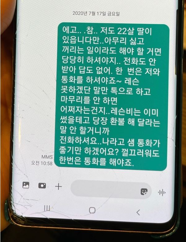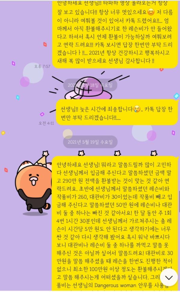 - 또한 A씨는 계속해서 로잘린에게 연락을 취하며 환불을 요청했으나 어떠한 답변도 들을 수 없었다함. 결국, 지난 5월 참다 못한 A씨가 로잘린에게 전액 환불을 요청하자 그때서야 로잘린은 환불해줄 수 없다며 답을 해옴.
