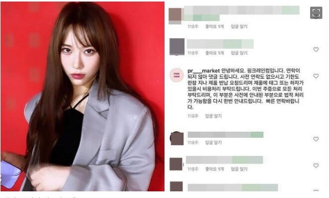 댓글은 PR 대행사 핑크레인컴이 작성한 것으로, 로잘린에게 협찬 제품을 반납하라고 요구하는 내용인데, 핑크레인컴은 "연락이 되지 않아 댓글을 남긴다"라며 "사전 연락도 없으시고, 기한도 한참 지나, 제품 반납 요청드린다"고 말했습니다.
