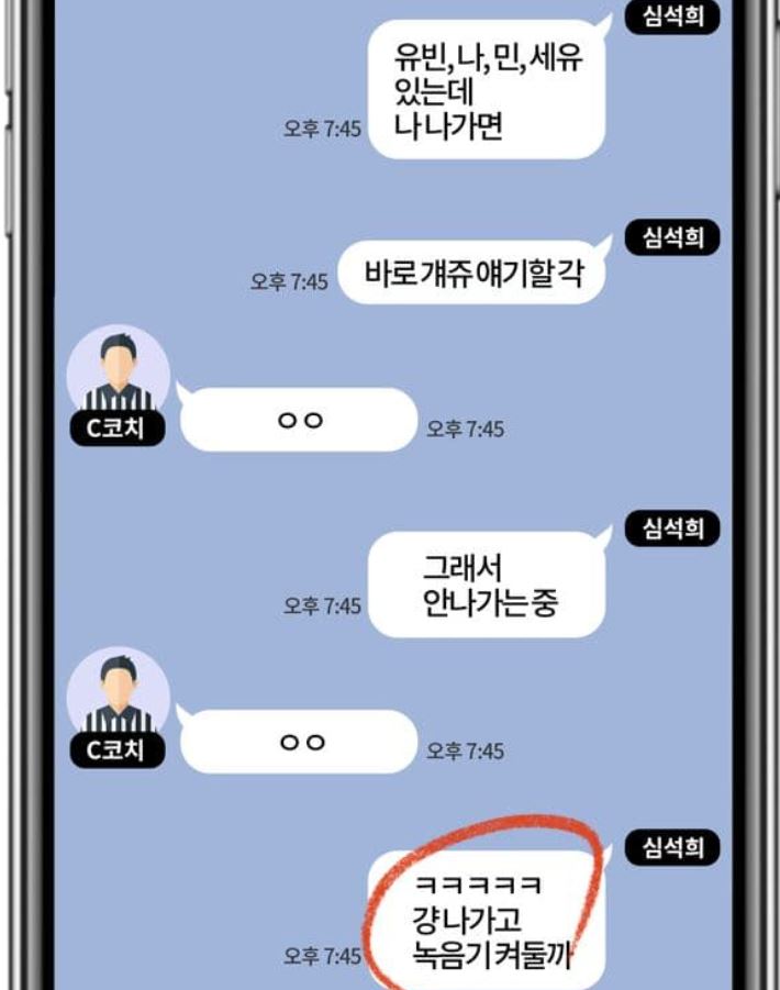 심석희는 이후 같은 날 8시 30분경에는 3000m 계주 결승의 출전 순번에 관해 얘기를 하면서 "핸드폰 녹음기 켜놓고 라커룸에 둘 거니까 말조심하고 문자로 하자"고 말했다. 이에 대해 C 코치와 심석희는 서로 "ㅇㅇ"이라는 문자를 주고받으며 녹음 행위에 대해 서로 동의했다는 것으로 추정되는 메시지를 보냈습니다.