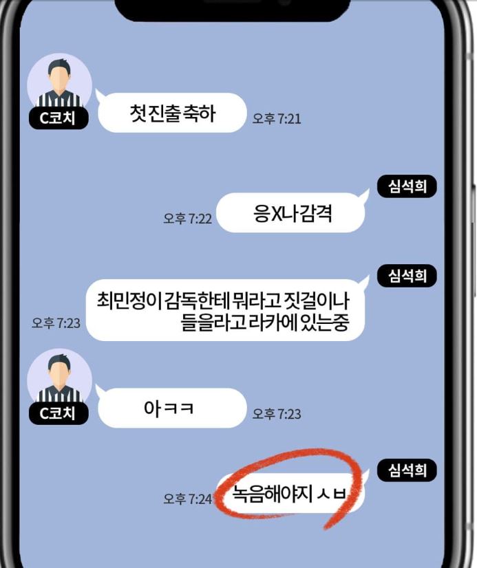 C 코치가 심석희에게 "첫 진출을 축하한다"고 하자 심석희는 "응, X나 감격. 최민정이 감독한테 뭐라고 지껄이나 들으려고 락커에 있는 중"이라고 대답했습니다. 곧 이어 심석희는 "녹음해야지 XX"라고 말했다.