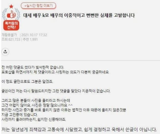 안녕하세요, 한 남자 배우의 사생활을 저격한 폭로글이 공개됐습니다. 글쓴이 A씨는 "대세 배우 K의 이중적이고 뻔뻔한 실체를 고발한다"라며 K배우가 낙태를 회유하고 혼인빙자를 했다고 주장했습니다.