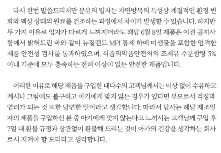 회사는 검사에서 이상이 없다는 결과가 나왔지만 손해를 감안하고서라도 적극적인 환불 조치를 실시하고 있다는 입장인데, 시중에 유통되는 6월 8일 제조 분유에 대해선 몽글거림 현상을 고지하고 판매를 이어가고 있는 것으로 확인됐습니다. 해당 제품은 퓨어락분유 입니다.