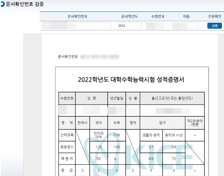 이후 해당 화면에 노출된 문서확인번호로 한 네티즌이 직접 성적표 확인을 시도하면서 상황이 반전됐습니다. 해당 네티즌이 확인한 수능 성적표에는 2~4등급대 점수가 적혀 있었습니다.