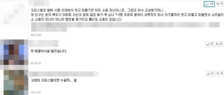 - 작성자는 "작년 이맘때 이사 온 이웃이 매주 2~3회 이상 친구들을 불러 새벽까지 고성방가 한다"라며 "인터폰을 통해 관리원에게 주의를 줄 것을 요청했고, 직접 방문해 항의까지 했지만, 그때뿐이었다"라고 하소연 함.