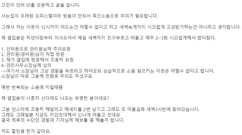 - 이어 "그렇게 소음 때문에 지칠 때쯤 제 이웃이 MBC 금요 예능 나 혼자 산다에도 나오는 유명한 사람인 걸 알았다"라며 "그분 SNS에 조용히 해달라는 메시지를 2번 남기고 또 직접 찾아갔지만 지금도 떠들고 있다"라고 주장함.