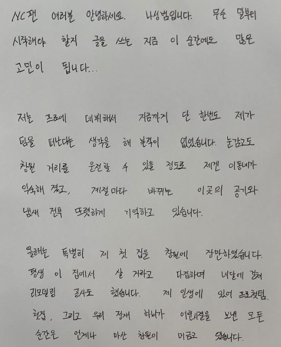 위에 편지는 10년간 NC다이노스 유니폼을 입었던 나성범이 오늘 팬들을 향해 보낸 편지인데, NC의 간판 외야수 나성범은 6년 150억에 KIA 타이거즈로 이적했습니다.