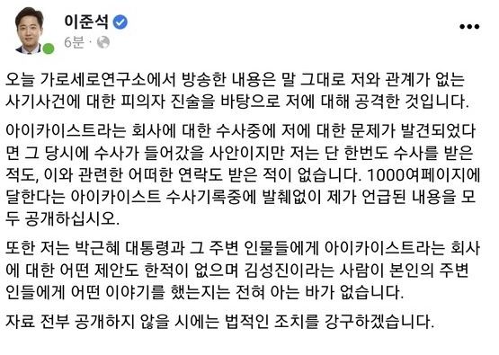 이준석 대표는 2021년 12월 27일 자신의 페이스북을 통해 "오늘 가로세로연구소에서 방송한 내용은 말 그대로 저와 관계가 없는 사기사건에 대한 피의자 진술을 바탕으로 저에 대해 공격한 것"이라며 "아이카이스트라는 회사에 대한 수사중에 저에 대한 문제가 발견되었다면 그 당시에 수사가 들어갔을 사안이지만 저는 단 한번도 수사를 받은 적도, 이와 관련한 어떠한 연락도 받은 적이 없다"고 밝혔습니다.